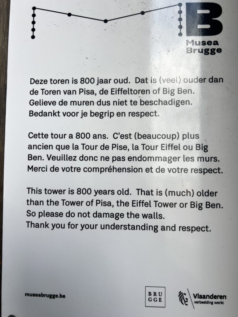 The Belfry is a UNESCO World Heritage Site and has been protected as such since the 1930s. However, it is said to have been there (as a type of building, maybe not a belfry) since the 13th century. There are 366 steps to the top, but it is broken up by floors with historical facts and artifacts to look at and read about.