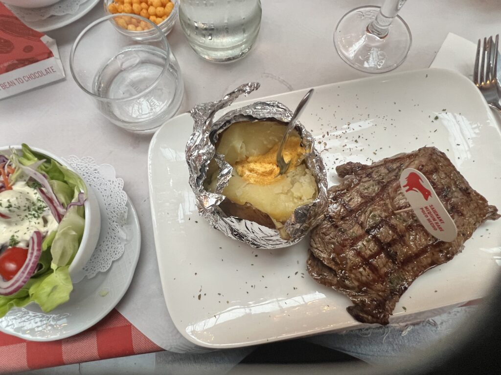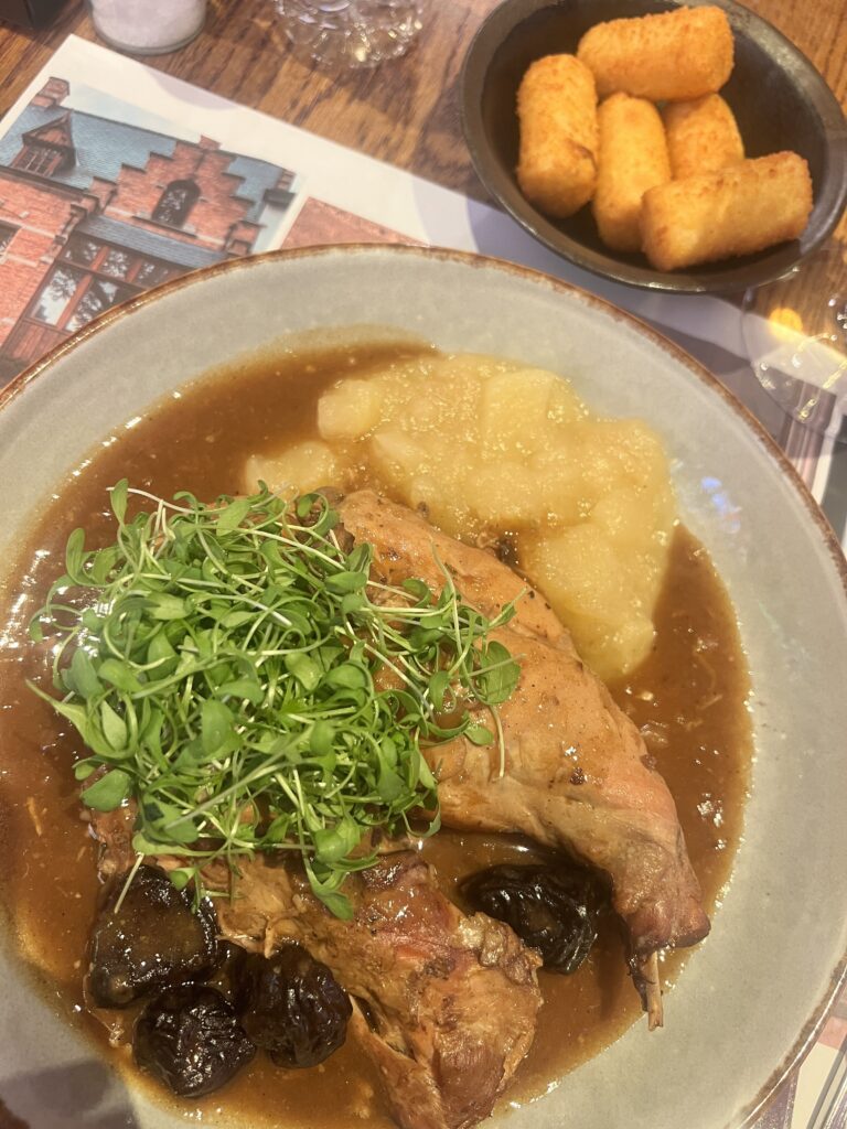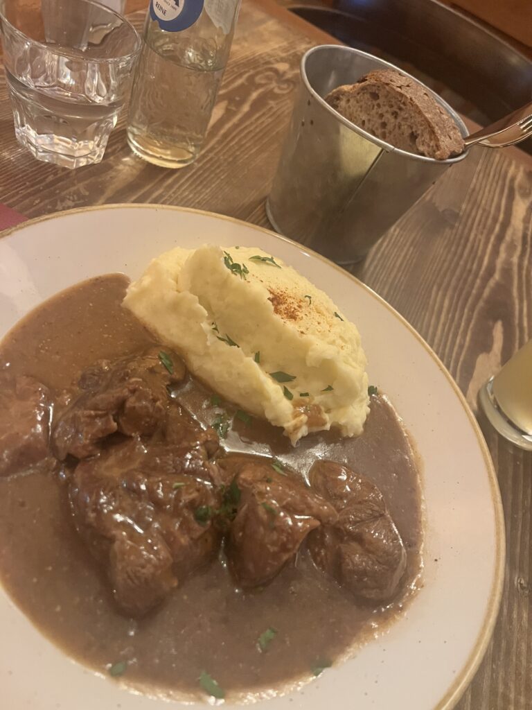 This was a recommendation from my walking tour guide, and we ended the tour pretty close to it, which was perfect! It is a small-ish restaurant with bar seating if you prefer. It was giving pub vibes for sure, and I loved it. The staff were very friendly and spoke English. I decided to try something a little different that I’d never had before, and went with the rabbit with plum sauce and mashed potatoes. It was really good, even though I couldn’t stop thinking about the fact that I was eating bunny… I also tried the blonden os here, and was perfectly tipsy after one!