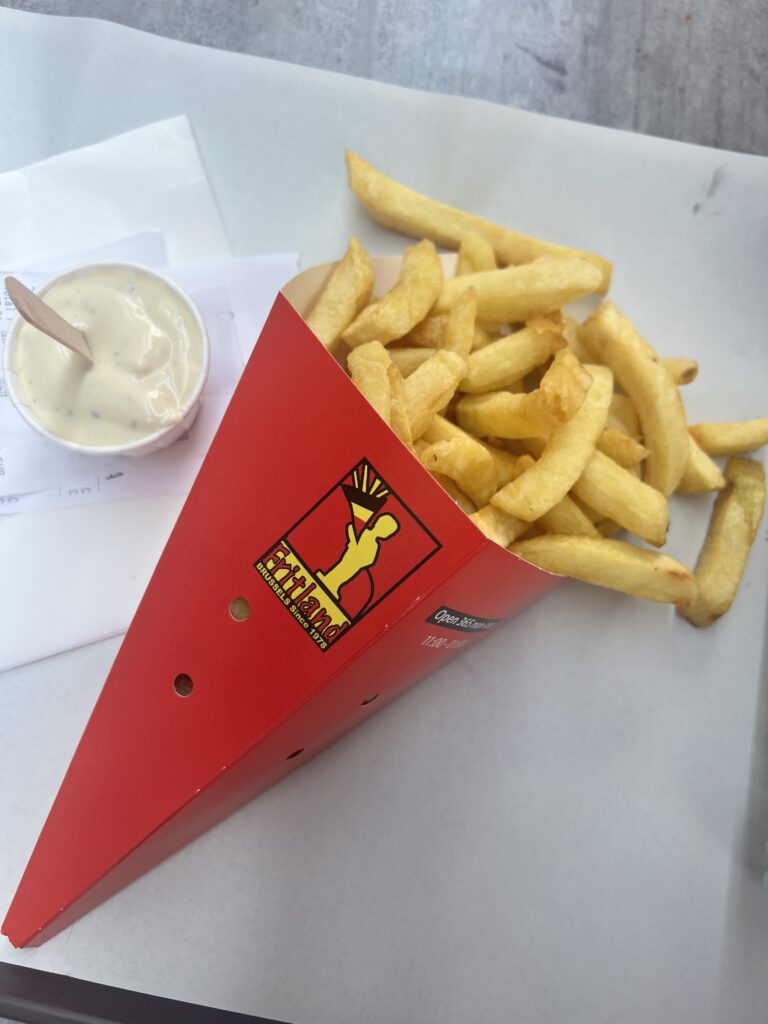 Frites are a staple in Belgian food, so naturally, I had to try some. Recommended again by my tour guide from the chocolate tour (obviously I put all my trust into this man)! Fritland is a chain, but supposedly one of the best. You can get all sorts of things with frites, but I decided to be go simple and just order plain frites with one of their MANY sauces. I chose the pita sauce, which is mayo, garlic, and herbs. The frites are double fried in beef fat. So very healthy! I can personally recommend these though, they were delicious! Note: I did wait 20 minutes in the queue – you can see it in the photo.